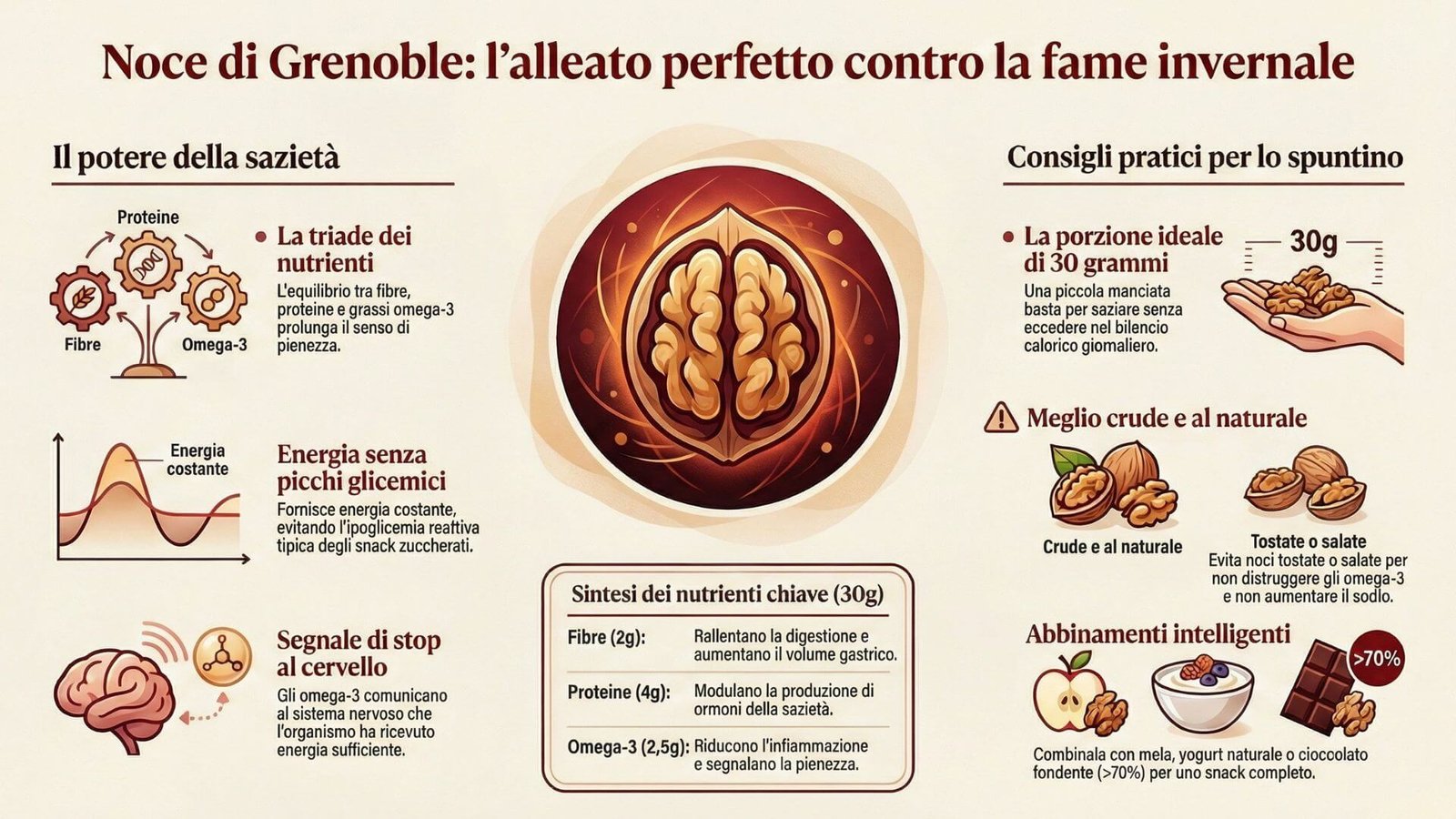 Durante l’inverno, il nostro organismo si trasforma in una piccola centrale energetica che lavora incessantemente per mantenere la temperatura corporea fissa a 37°C. Questa attività, detta termogenesi, comporta un consumo calorico più elevato rispetto alle stagioni più calde. Il cervello recepisce questa maggiore richiesta calorica e invia segnali intensi per ottenere un rifornimento rapido di energia. Proprio per questo motivo, nelle giornate grigie o fredde, la voglia improvvisa di snack zuccherati o ricchi di carboidrati raffinati diventa quasi un riflesso automatico. Purtroppo, queste scelte alimentari portano a picchi glicemici immediati seguiti da un rapido calo, noto come ipoglicemia reattiva, che alimenta nuovamente la fame e genera stanchezza e irritabilità. Questo ciclo di consumo di calorie vuote e cali energetici è tra le cause più frequenti dei chili di troppo accumulati durante l’inverno e di una sensazione persistente di malessere. È quindi fondamentale optare per spuntini che forniscano energia stabile, modulino la fame e favoriscano una sazietà prolungata. Tra gli alimenti più efficaci per spezzare questo circuito vizioso, la noce di Grenoble emerge come una scelta vincente: grazie al suo profilo nutrizionale, è in grado di fornire un’energia durevole che sostiene l’organismo senza danneggiare l’equilibrio glicemico.